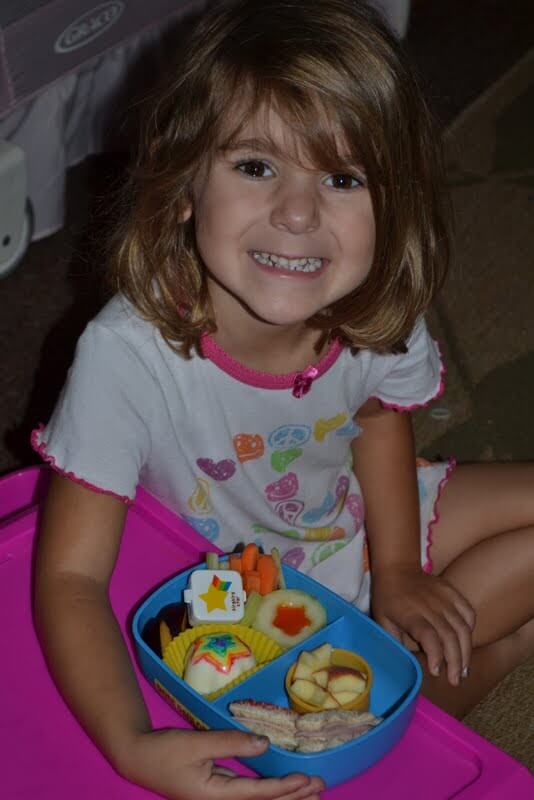 Rose is still unwell. We've been to the Dr once this week and are supposed to call in to report tomorrow. I imagine they will want to see her again. This lunch certainly cheered her up and she wanted me to take a photo of her with her lunch. She still picked at her food - ate the whole egg and all of the apple stars plus a few bites of everything else. Success in my book.