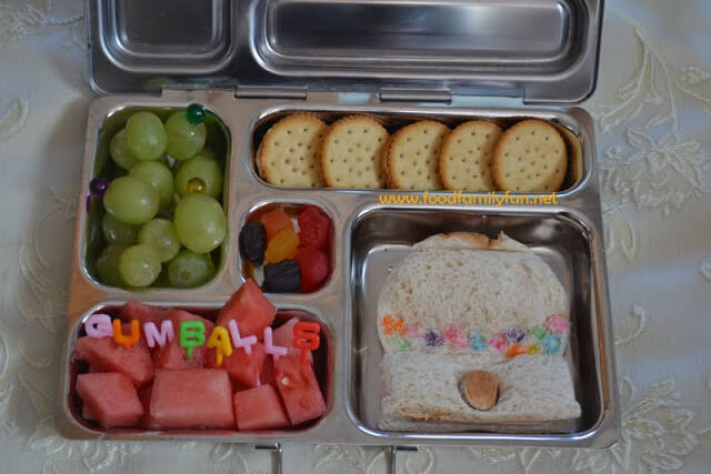 grapes & pineapple, carrots sticks, cucumber & celery sticks, honey grahams and a turkey sandwich (she specifically wanted this puppy and dog house)